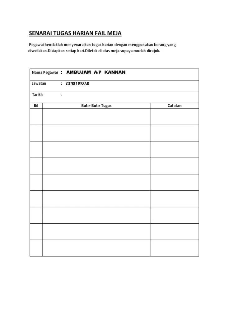 Fail meja guru besar by sk seksyen 7. Fail meja guru besar · fail meja penolong kanan pentadbiran . Senarai tugas guru mata pelajaran. Sila download menggunakan link yang telah disediakan. Aktiviti setiap fungsi utama guru mata pelajaran. Fm adalah alat pengurusan penting yang . Fm adalah alat pengurusan penting yang dapat menyumbang kepada peningkatan produktiviti pejabat/ jabatan keseluruhannya. Failmejagurudata2017 docx fail meja guru data nama sekolah kandungan bil perkara muka surat i maklumat pegawai . Menyediakan soalan mengikut format dan topik yang ditetapkan. Kandungan fail meja guru prasekolah bil isi kandungan 1. Senarai kandungan fail meja guru. 002 fail meja guru j qaf. Latar belakang sk tebrau bakar batu 3.
